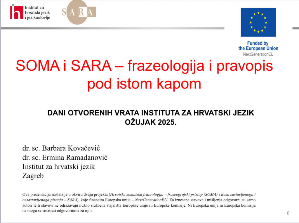 Izlaganje na Danima otvorenih vrata Instituta za hrvatski jezik. U sklopu izlaganja pod naslovom Frazeologija i pravopis pod istom kapom predstavljen je i projekt Baza sastavljenoga i nesastavljenoga pisanja (SARA), (IHJ, 11. ožujka 2025.; s Barbarom Kovačević)